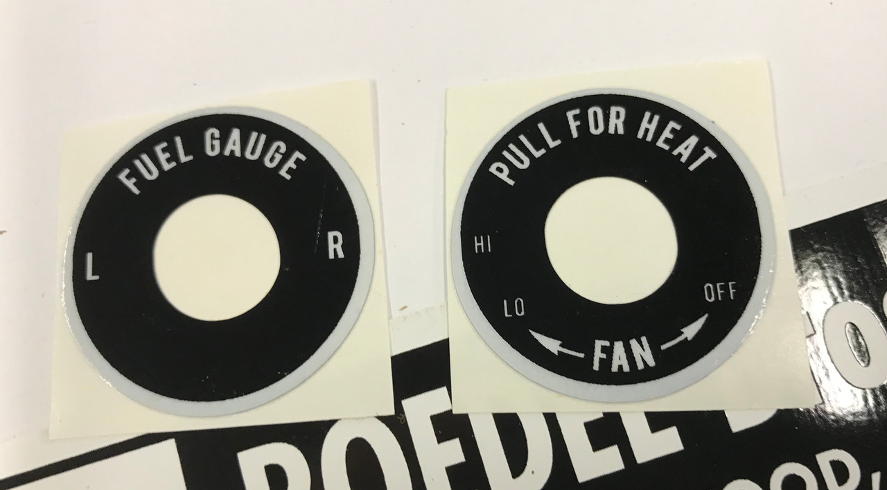 Reproduction heater fan and fuel selector plates (decals) for Scout 80, 800; and C-Series Pickup and Travelall.
