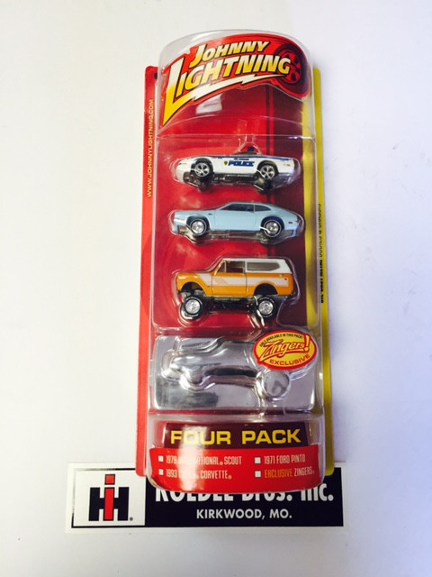 Collectible Johnny Lightning 4-pack: Off-road 1979 International Scout, Beat the Heat 1993 Chevy Corvette Police Car, 1971 Ford Pinto, and a surprise Zingers release. See photo.