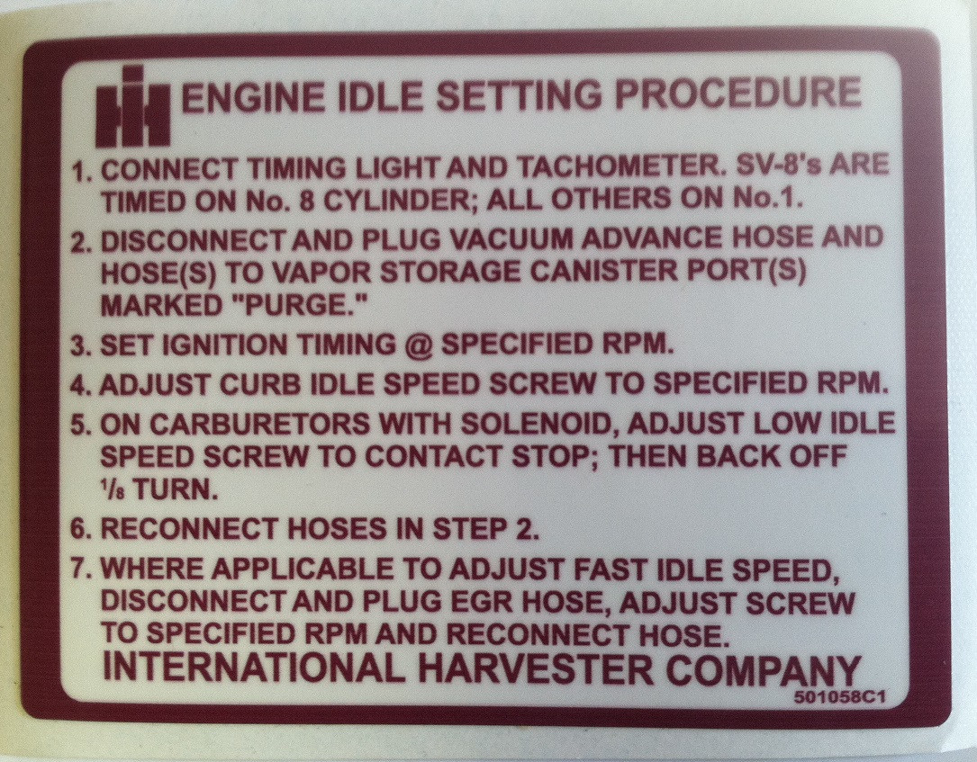 High quality, restoration grade reproduction of the Engine Idle Setting Procedure decal from 1979-80 Scout II, SSII, Traveler and Terra.