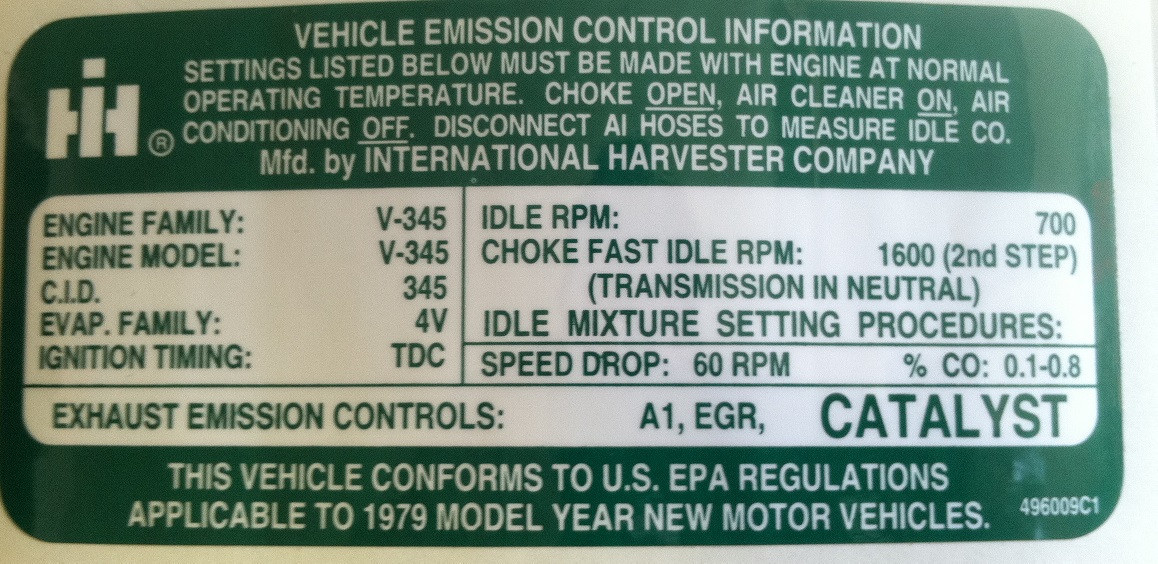IH Vehicle Emission Control Information decal for 1979 Scout II, Traveler, Terra and SSII equipped with V-345 engine.